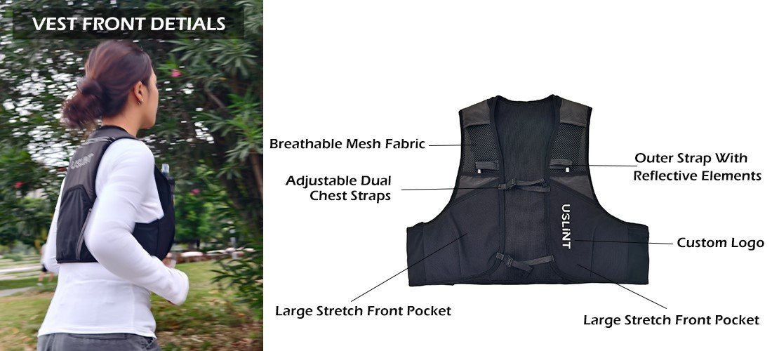 This running vest also features multiple functional pockets, including two large, soft, elastic front pockets for storing essentials like water bottles and energy bars, ensuring easy access and replenishment of fluids and energy. Additionally, there are two reflective external straps on the front for hanging running gear. The adjustable chest strap allows for customization to fit your body better, reducing movement and friction. Two zippered pockets on the back provide convenient storage for lightweight clothing, tissues, towels, and other items. However, note that the top zippered pocket is slightly smaller than the bottom zippered pocket. Additionally, both the front and back of the outdoor running vest can be customized with your logo, effectively helping you enhance your brand image.