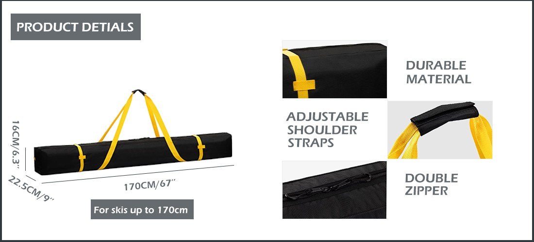 Made of high-density polyester fabric, offering excellent waterproof performance and effectively preventing snow and water ingress. It’s specifically designed for outdoor snow sports. Measuring 170×22.5×16cm, it can accommodate skis up to 170cm in length. The internal aluminum alloy frame enhances structural strength and pressure resistance while remaining lightweight. It features a high-quality bimetallic zipper for smooth and durable opening and closing; the adjustable shoulder strap and combinable handle design make it more flexible and convenient to carry.